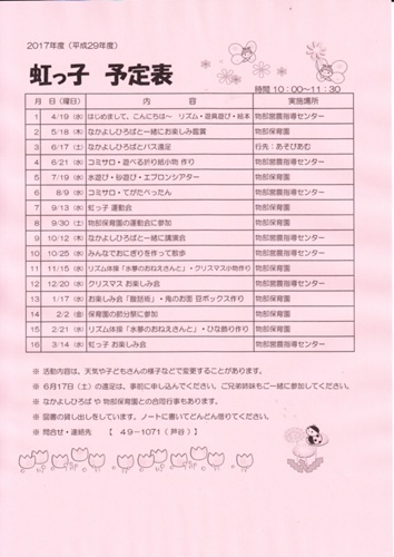 物部営農指導センターや物部保育園・園庭解放による子育て支援。 地域住民と子ども達の交流の場を目的に活動しています。 平成26年度虹っ子予定表 ← クリックして、画面の下の【ファイルを開く】もクリックする