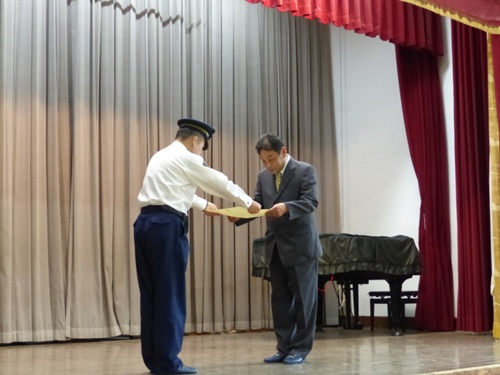 綾部市立物部保育園バスのお披露目会(平成28年10月11日) 寄贈…三ツ星ベルト技研株式会社様(綾部工業団地に平成11年設立)と三ツ星ベルトふれあい協議会様(従業員の皆様で構成) 綾部市長 山崎善也様 ご挨拶 まゆピーダンス