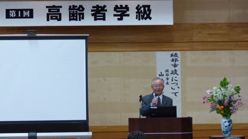 「物部高齢者学級の受講生」 綾部市教育委員会 概ね65歳以上の方ならどなたでも参加していただけます。 <第1回開級式>平成28年5月13日 ○学級長挨拶 植田敏昭様 ○物部公民館長挨拶 田中昭平様 ○講演「住んでよかった 住みたくなる 綾部をめざして」 綾部市長 山崎善也様 <平成28年度実施計画>